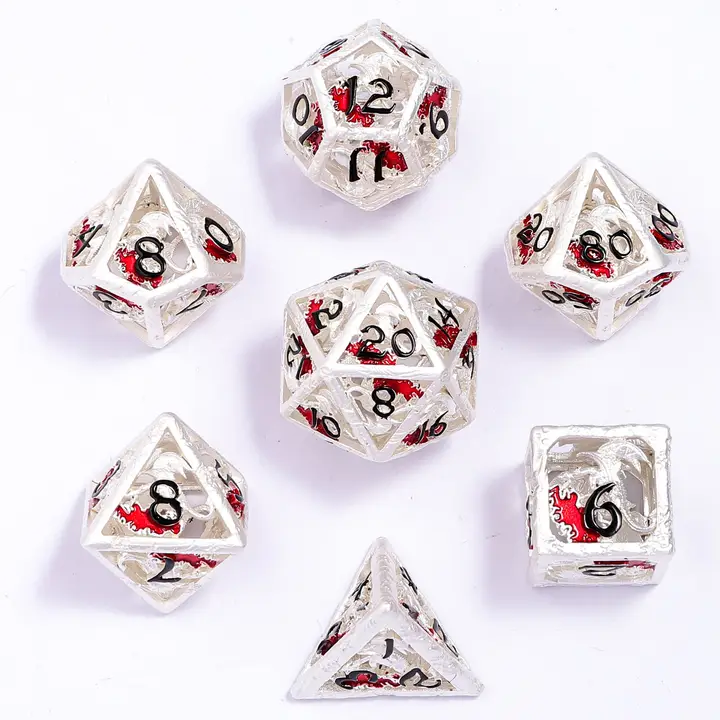 Set of 7 polyhedral dice in silver hollow metal.