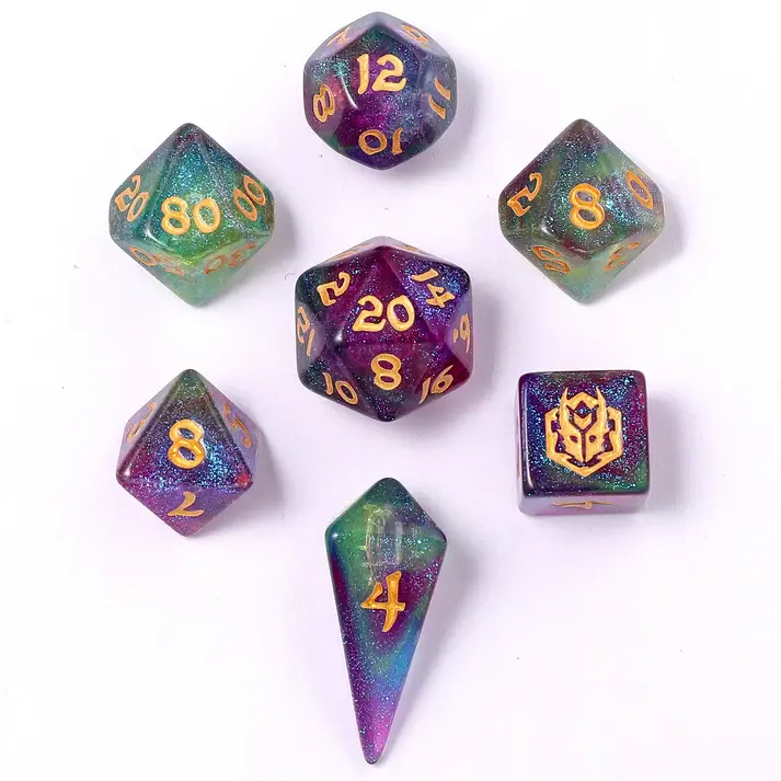 Set of 7 mini polymer dice, same design as the 8-piece version of the same series!