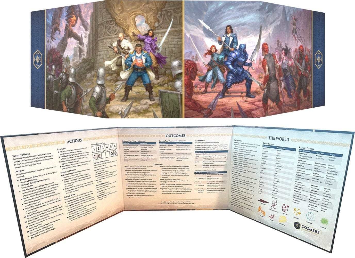 The Stormlight™ GM screen is a full color, three-panel GM screen arranged in landscape format for easy viewing over the top of the screen. Includes common game rules for actions, conditions, and other useful information.