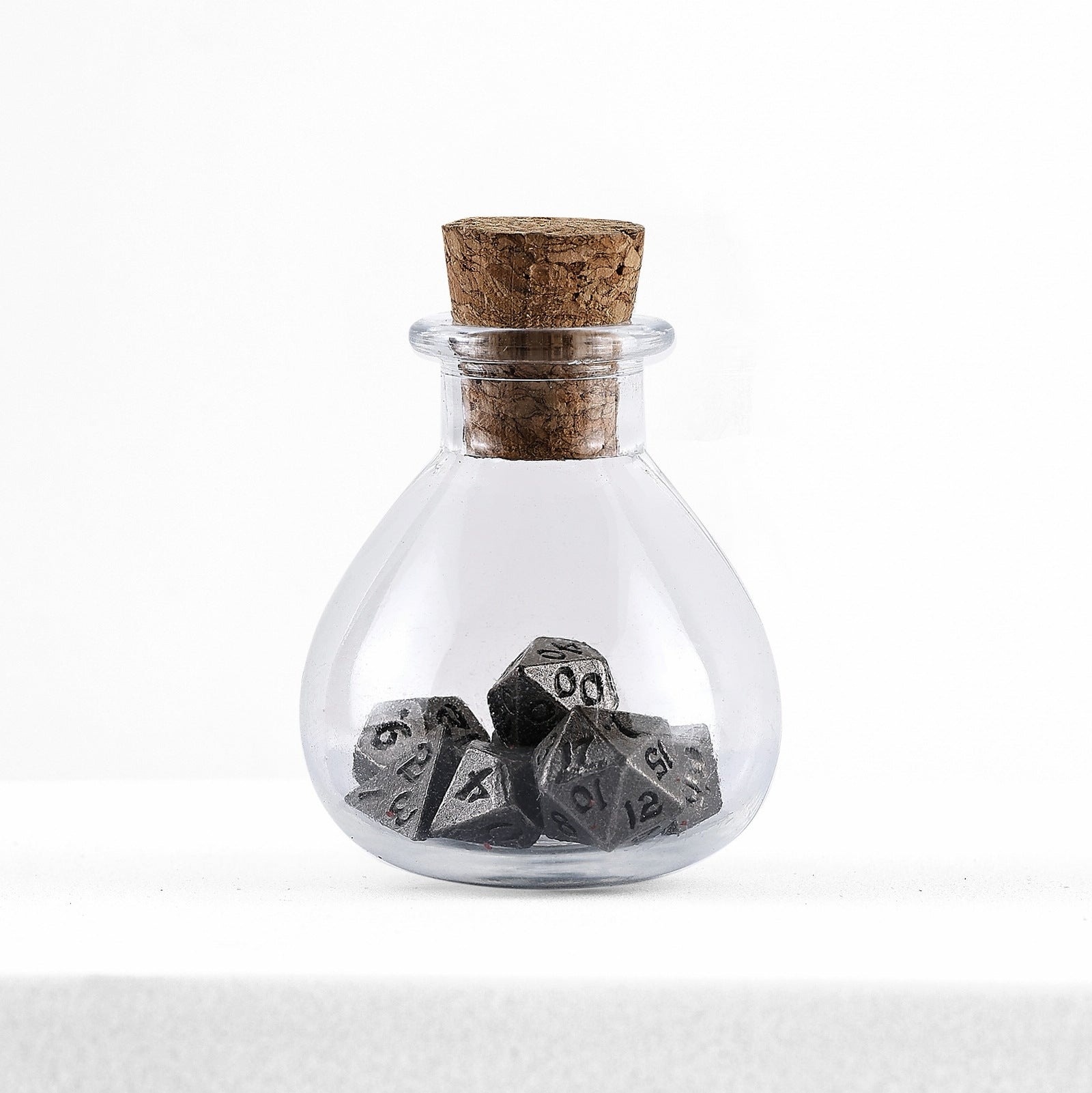 Set of 7 mini solid metal polyhedral dice. Each set comes in a tiny potion bottle!