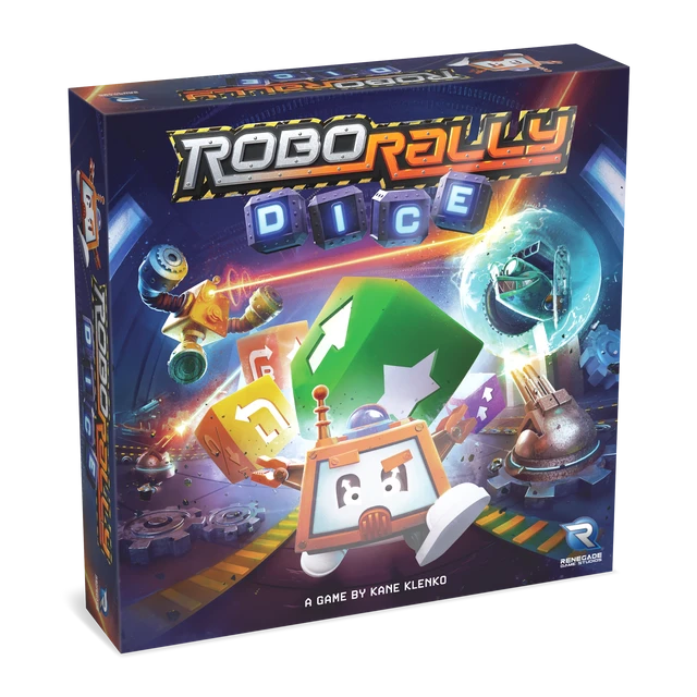 Robo Rally Dice is a competitive racing game full of robotic pandemonium! Use real-time dice rolling to program your robot to tag checkpoints, attach powerful upgrades, and turn this dreary old warehouse into a fabulous, fast, and frenzied fun factory! Robo Rally Dice is a standalone game, but the gameboards can be used as an expansion for any version of Robo Rally.