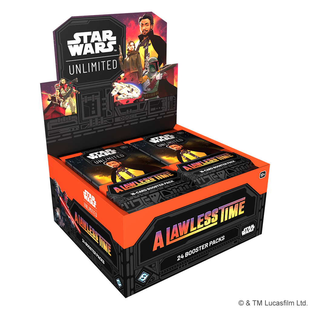 Expand your collection with A Lawless Time booster packs! In this booster pack display, you’ll find 24 individually wrapped booster packs. In each pack, you’ll find 16 cards to add to your collection, including approximately 9 common cards, 3 uncommon cards, 1 rare or legendary card, 1 leader, 1 base/token, and 1 Hyperspace-foil card.
